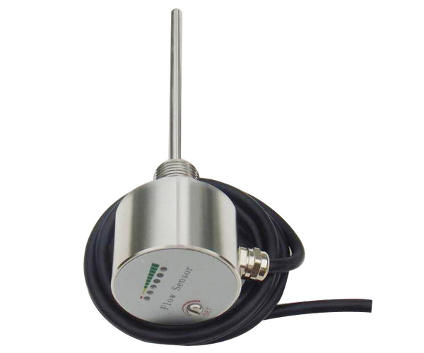 DX-600系列热导式流量开关是基于热交换原理设计的。探头内置发热模块及感热模块,流量开关的热传导同介质的流速密切相关,测量时,由发热模块发出热量,如果管道内没有介质流动,则感热模块接收到的热量是一个固定值,当有介质流动时,感热模块所接收到的热量将随介质的流速变化而变化,感热模块将这温差信号转化成电信号,再通过处理器将其转换为对应的标准模拟量信号或接点信号输出,流量开关通过这个信号对介质的流速进行显示及控制。
