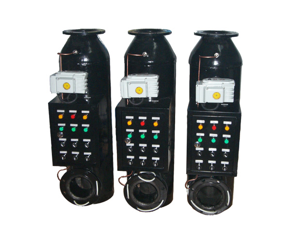本电子除垢仪正常工作时,排污口所接的排污阀关闭,蝶阀全开,被处理水经过滤网后流出,渣滓等被截留在水处理仪滤网内。排污时,关闭水处理仪下游的闸阀,同时关闭水处理仪辅机的蝶阀,打开排污阀。此时,被处理水在滤网前段流出,在滤网的后段(渣滓收集段)由外向里冲刷滤网后排污,对滤网有较强的自洁作用。